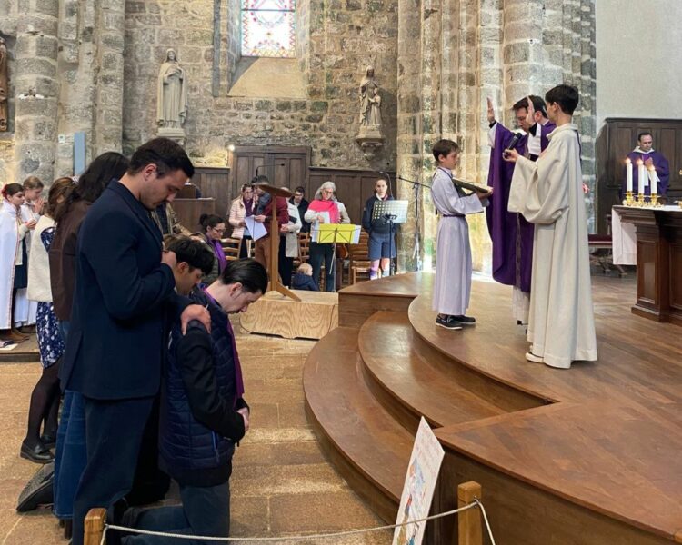 Notre nouvel évêque Mgr Renauld de Dinechin rappelle ce que demande l’Église dans la liturgie eucharistique : merci de s’agenouiller, si on le peut, en signe d’humilité et d’adoration, au moment de la consécration