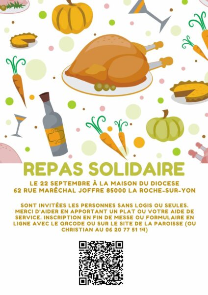 Pour ce repas solidaire du « 2e dimanche du mois » à destination des personnes de la rue ou isolées, nous avons besoin de plats et d’aide pour servir et fournir les repas (à partir de 10h). Les plats sont à déposer à la salle paroissiale La fontaine, 10 rue Lafontaine à La Roche sur Yon le 12 octobre à partir de 10H (rue sur le côté du presbytère St Louis, maison aux volets bleus)