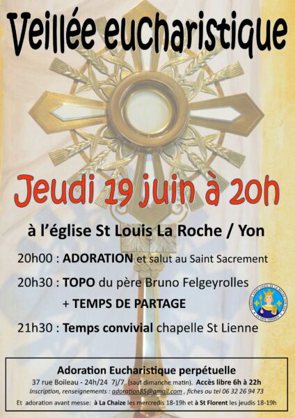 Les inscriptions à l’adoration eucharistique perpétuelle sont possibles à tout moment de l’année ! adoration85@gmail.com ou ’06 32 26 94 73′ Voir la page sur l’adoration